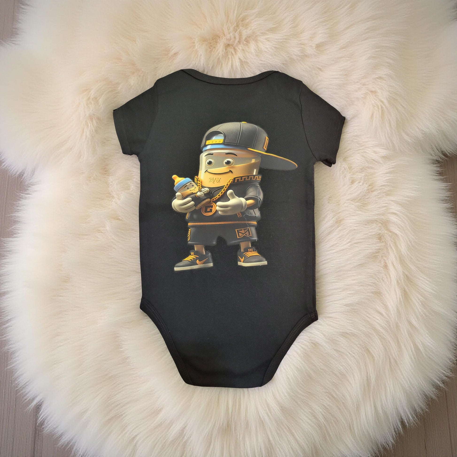 Introducing our unique collection of baby rompers featuring an adorable hip-hop styled baby bottle character with both front and back prints! Each black romper showcases a fun, relatable graphic on the front and a coordinating design or text detail on the back, perfect for expressing your little one's budding personality from every angle.