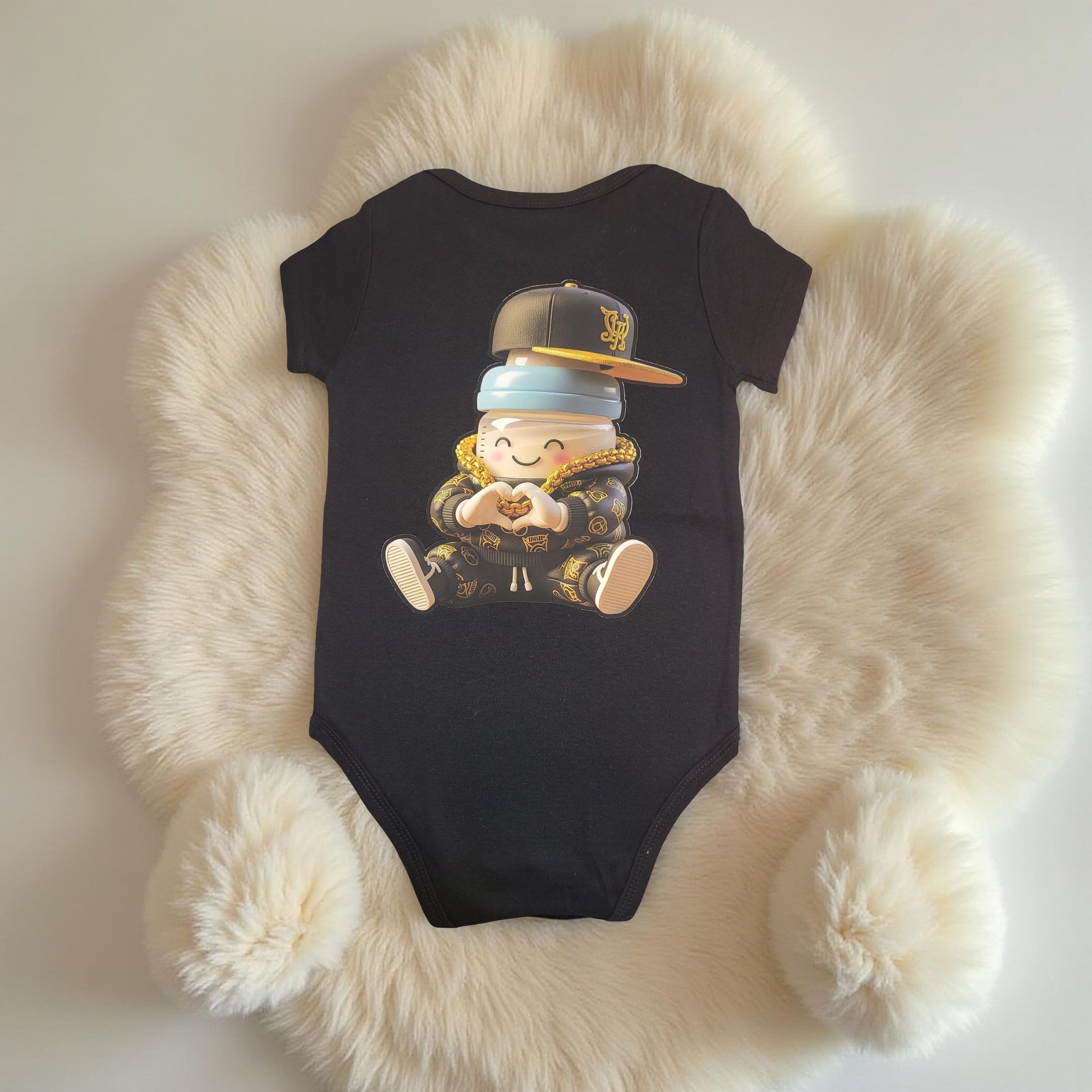 Introducing our unique collection of baby rompers featuring an adorable hip-hop styled baby bottle character with both front and back prints! Each black romper showcases a fun, relatable graphic on the front and a coordinating design or text detail on the back, perfect for expressing your little one's budding personality from every angle.