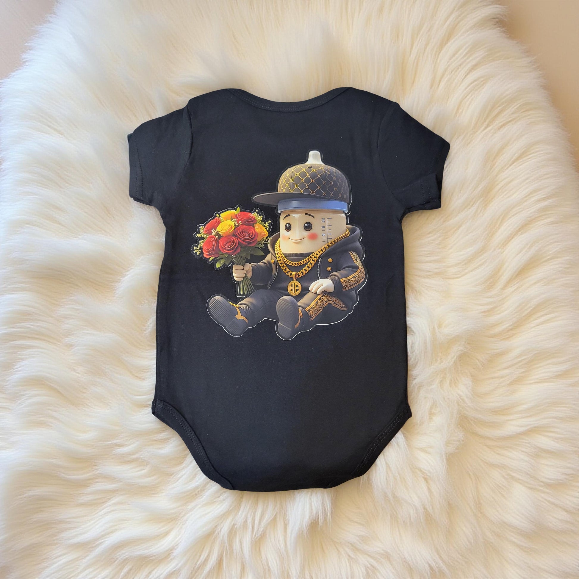 Introducing our unique collection of baby rompers featuring an adorable hip-hop styled baby bottle character with both front and back prints! Each black romper showcases a fun, relatable graphic on the front and a coordinating design or text detail on the back, perfect for expressing your little one's budding personality from every angle.